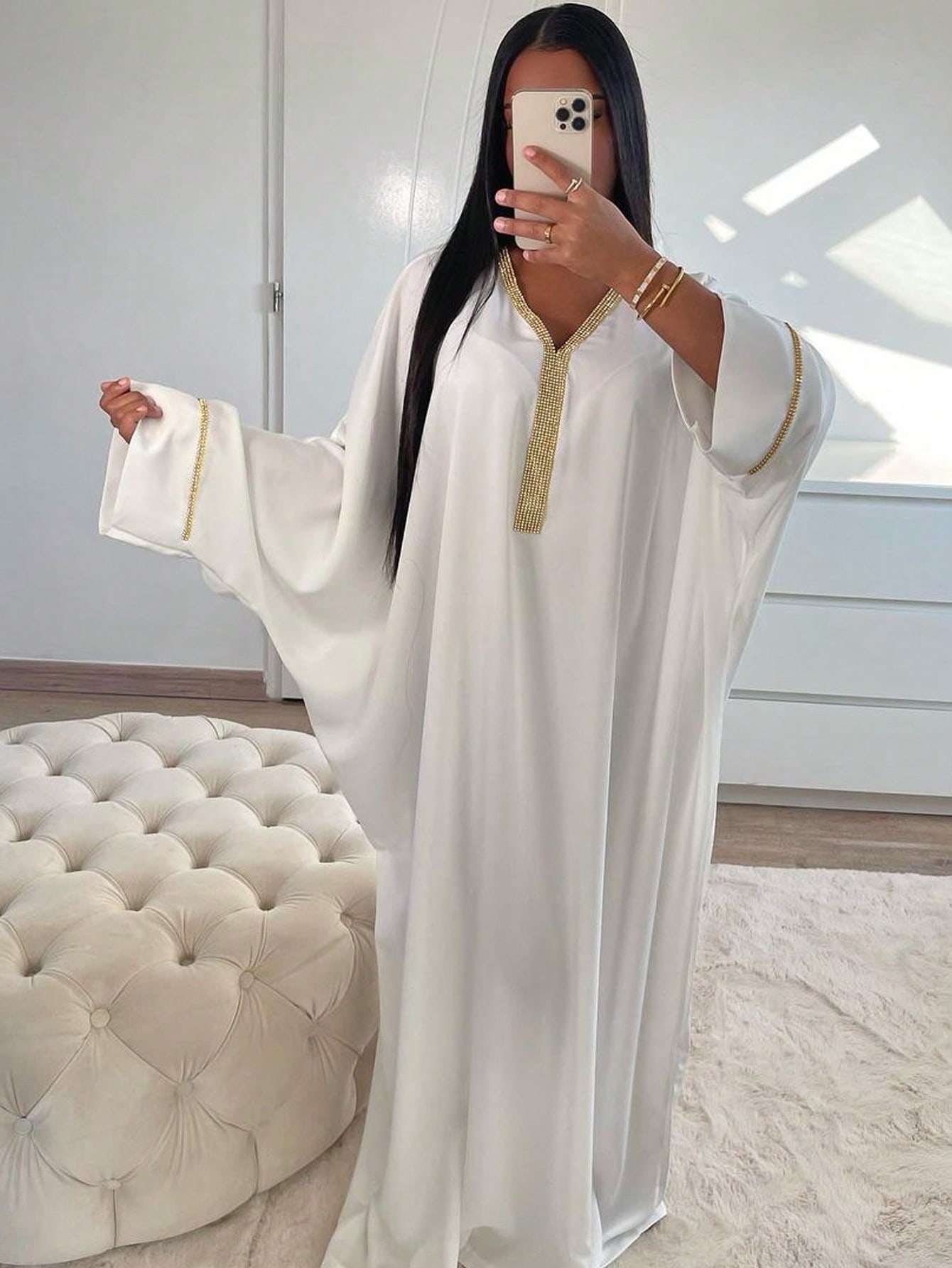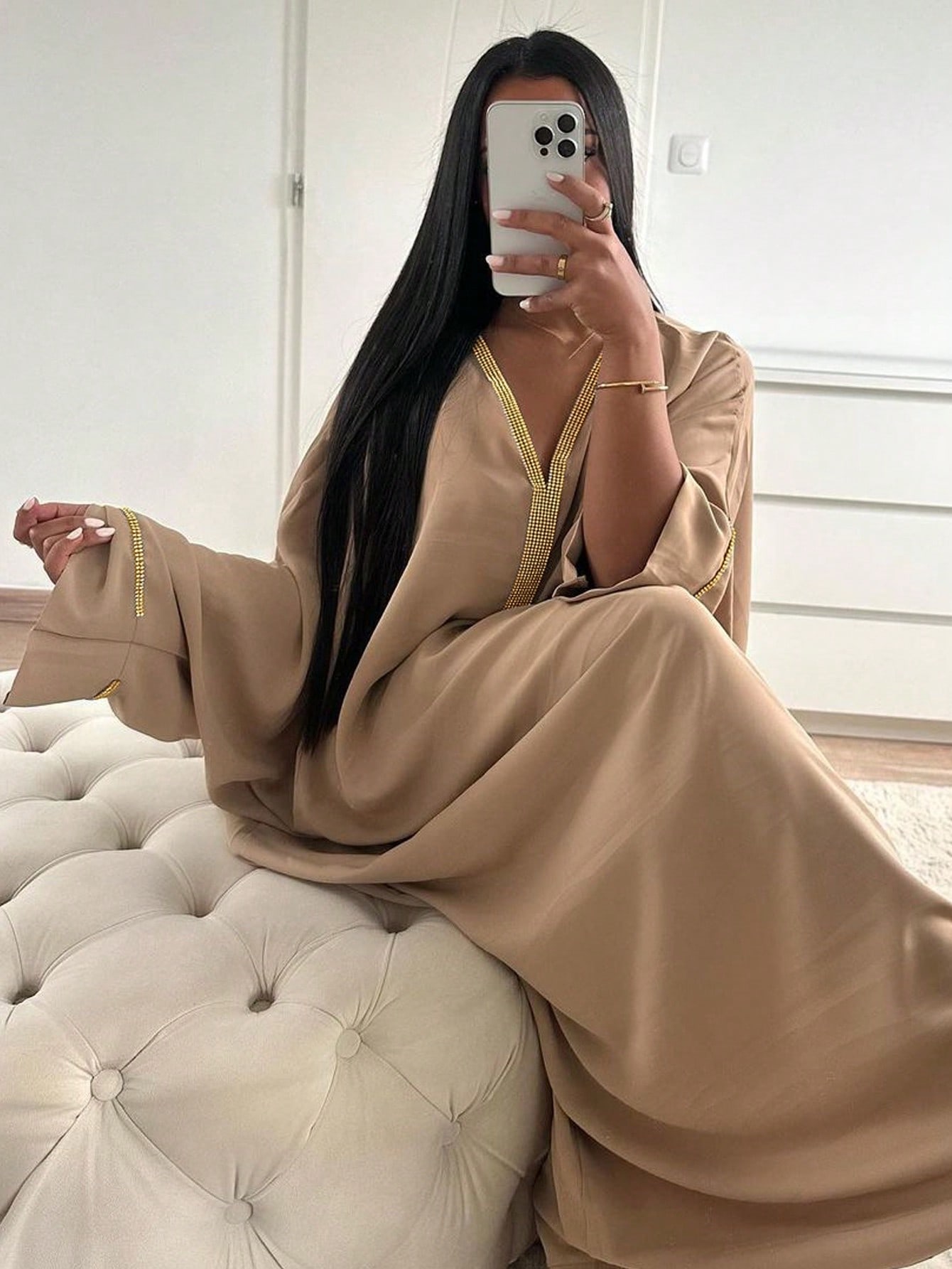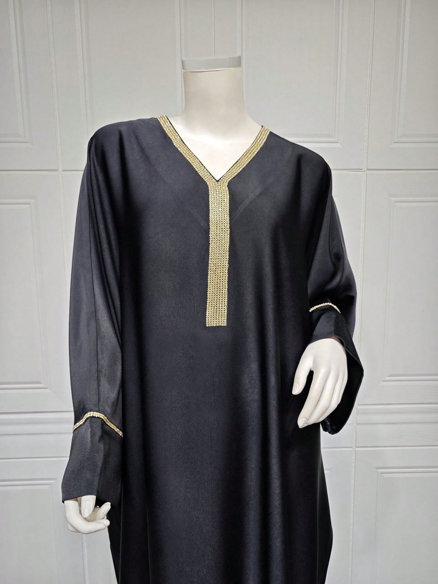 • Deze comfortabele en stijlvolle djellaba is ontworpen voor dagelijks gebruik. Gemaakt van hoogwaardige stoffen, biedt het een losse en vloeiende pasvorm die ideaal is voor ontspanning en casual activiteiten. De subtiele strass-details op de manchetten en kraag geven een verfijnde uitstraling, terwijl de lange mouwen en effen zwarte kleur zorgen voor een tijdloos en veelzijdig ontwerp.